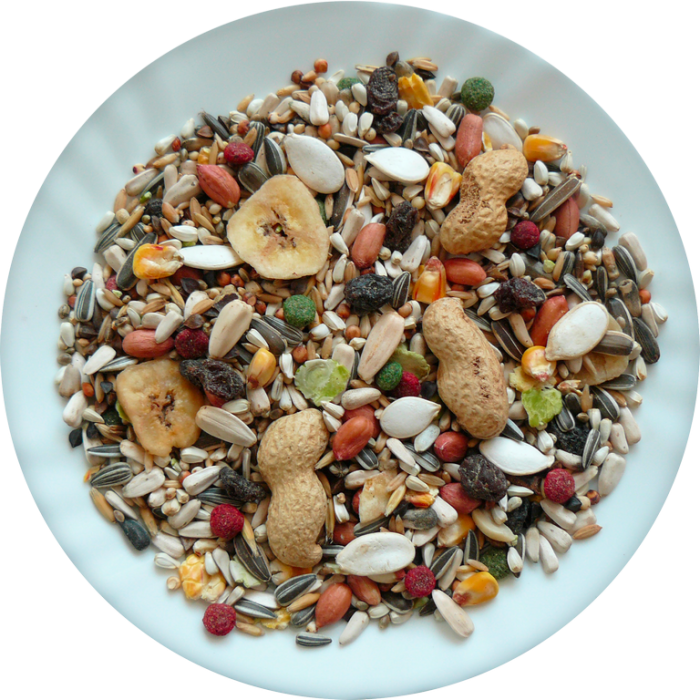 slunečnice (bílá, žíhaná), světlice barvířská, oves bezpluchý, pohanka, burské ořechy, čirok (bílý, červený), hrachové vločky, oves (žlutý, černý), dýňová semena, rozinky, konopné semeno, kukuřičné vločky, paddy rýže, extrudované granule s ovocem, banány, svatojánský chléb, pšenice