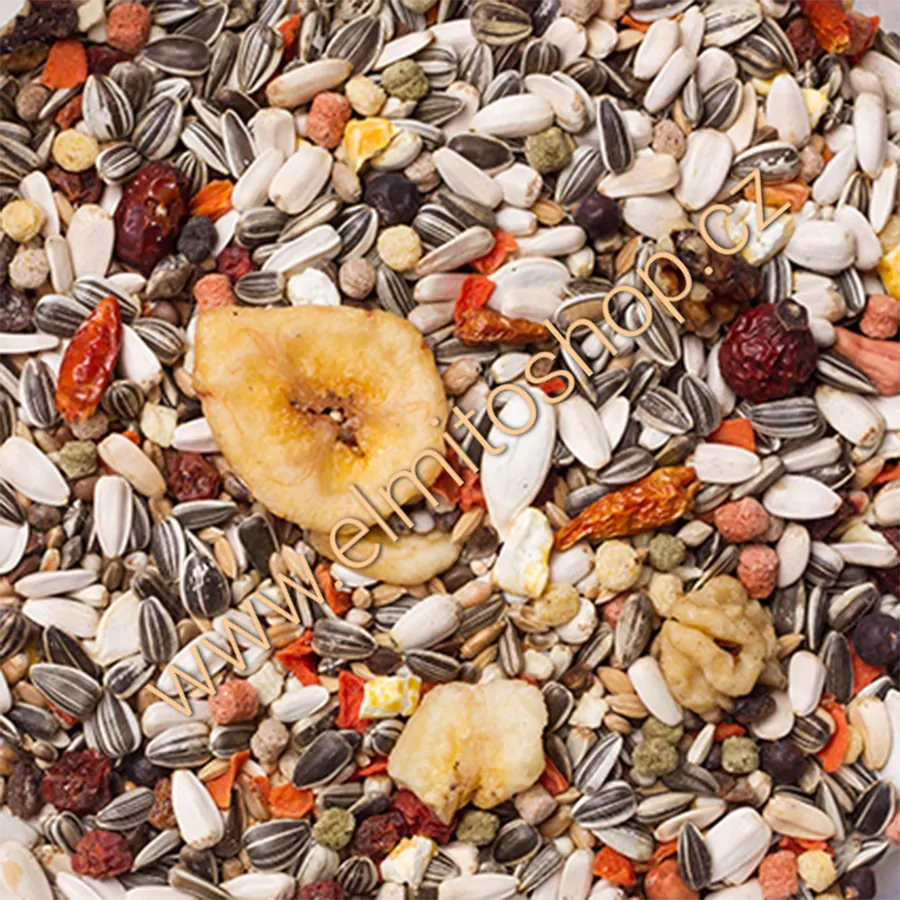 Slunečnice (žíhaná, bílá), kardi, dari bílé, pšenice, paddy rýže, pohanka, konopí, extrudované pelety, vikev, oves nahý, proso (žluté, bílé, japonské), grit, sušená mrkev, sušené banány, dýňové semeno, lesknice, sušené jeřabiny, ostropestřec, jalovec, sušená jablka a šípky, vlašské ořechy, rozinky, pufovaná kukuřice, burské oříšky loupané, chilly papričky