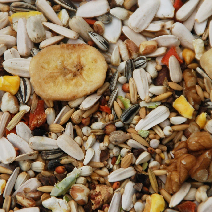 Složení: bílá slunečnice, kardi, žíhaná slunečnice, loupaný oves, pohanka, dýňová semínka, pufovaná pšenice, loupaný oves, pufovaná kukuřice, neloupaná rýže, piniové / cedrové ořechy, bílé proso, bílé dari, červené mungo, kousky mrkve, lesknice, rozinky , hrachové vločky, kousky vlašských ořechů, sušený banán.