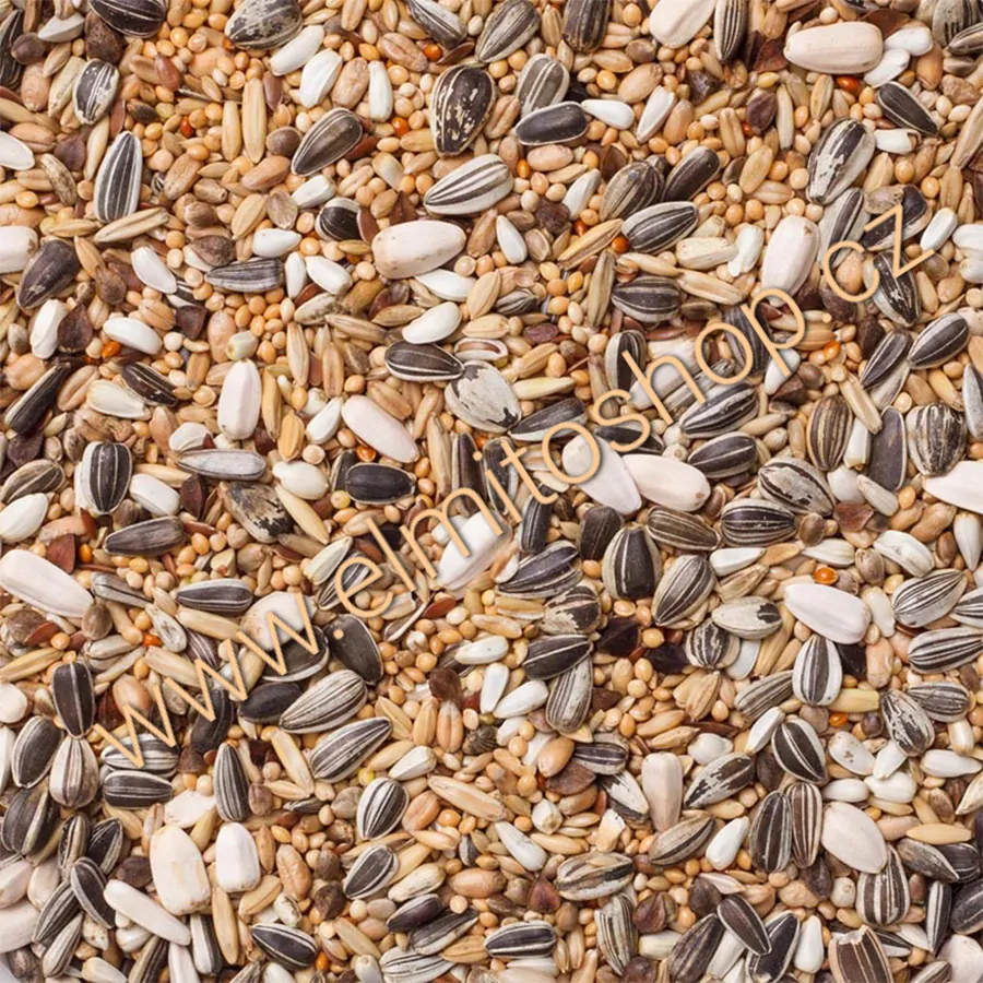 Žluté proso, lesknice, pšenice, bílé proso, loupaný oves, žíhaná slunečnice, kardi, bílá slunečnice, červené proso, len, konopí, pohanka, neloupaná rýže.